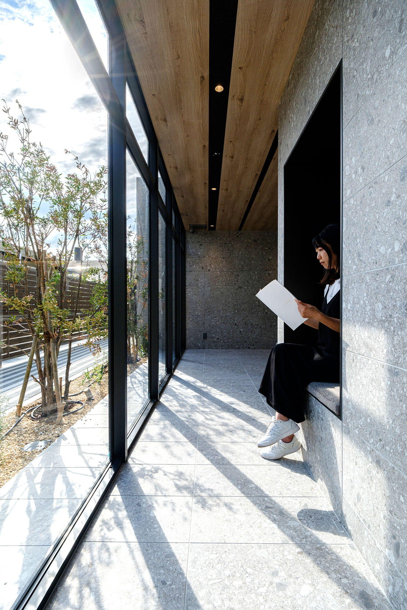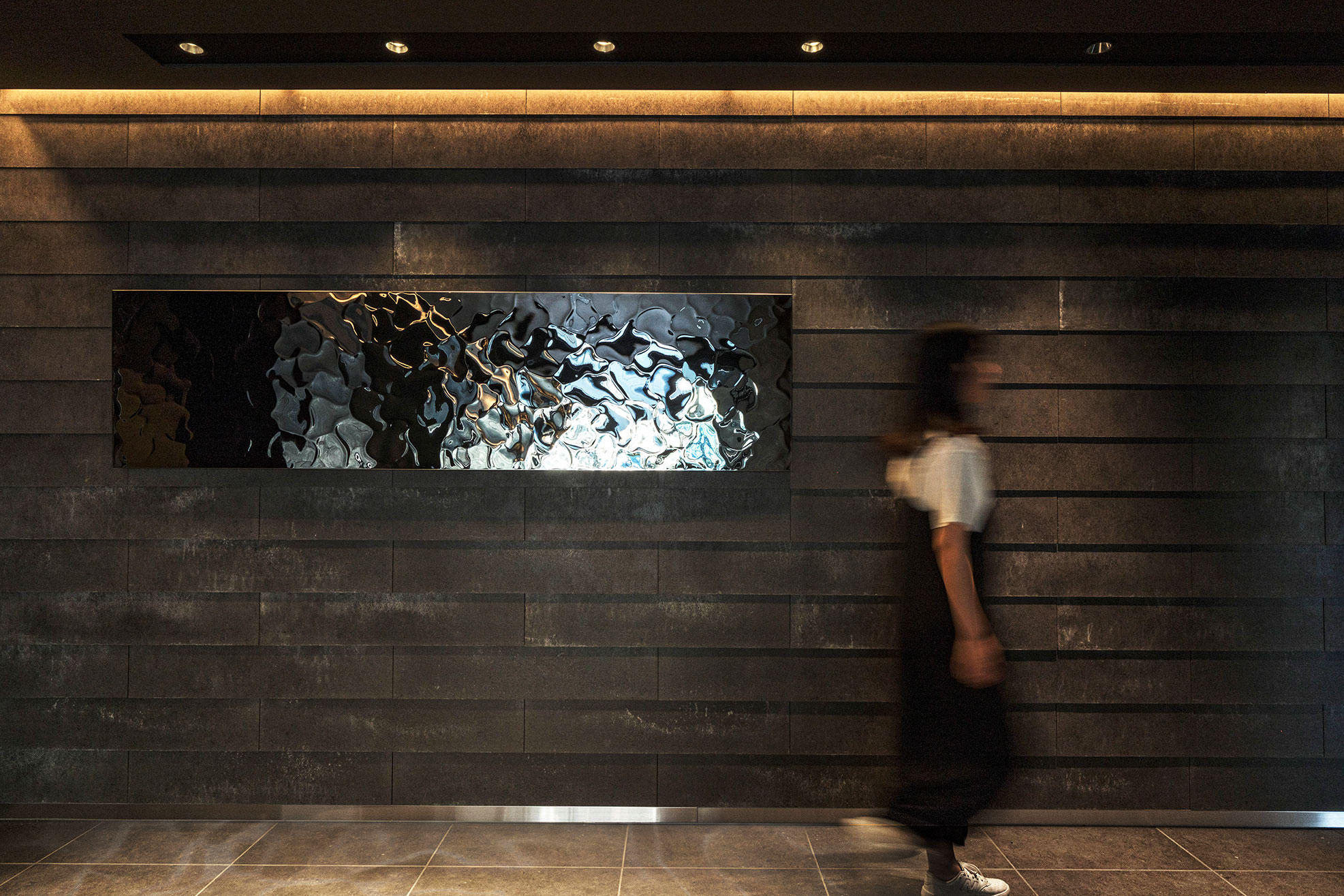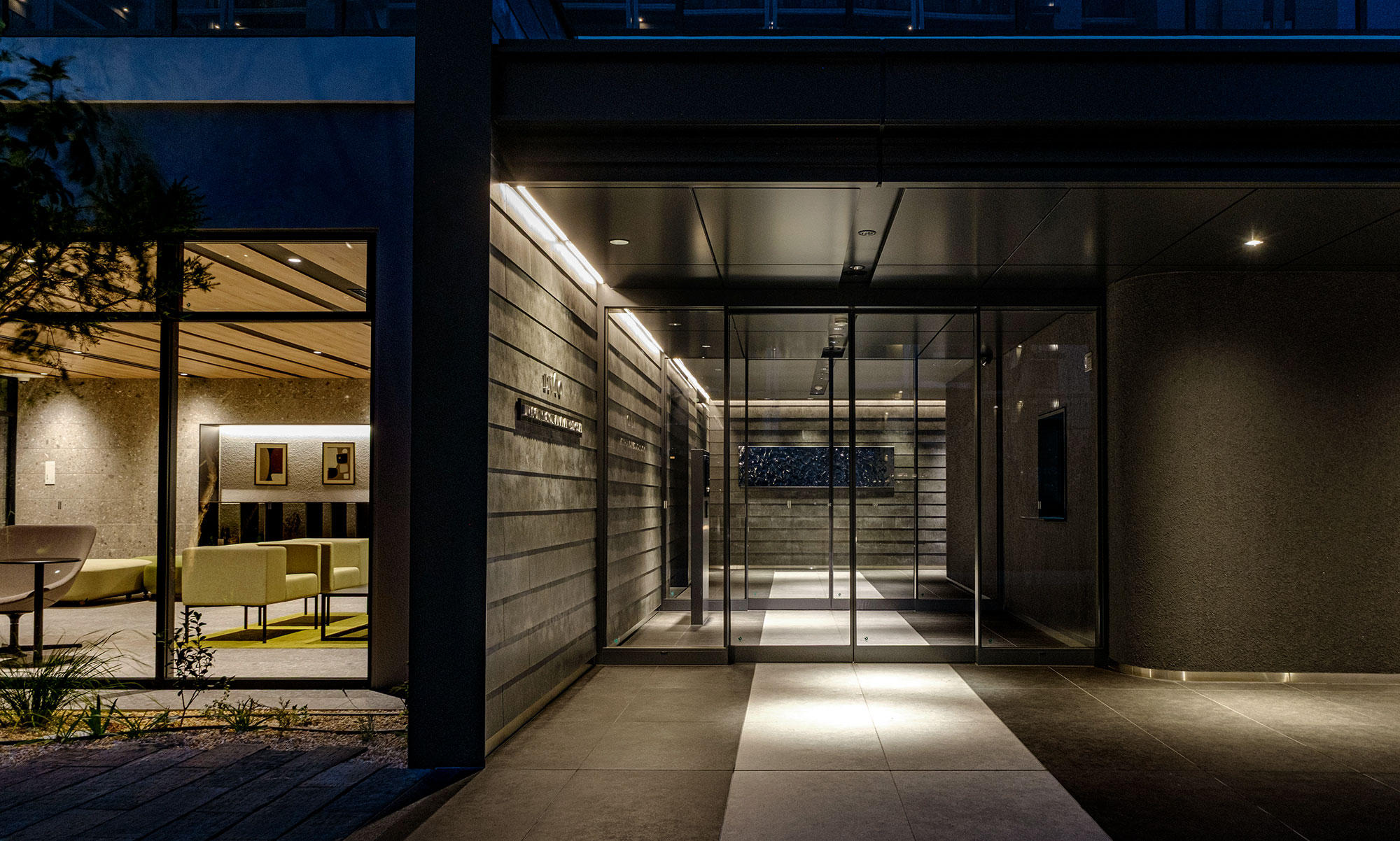 深みあるモノトーンのエントランスと柔らかな色合いのラウンジ